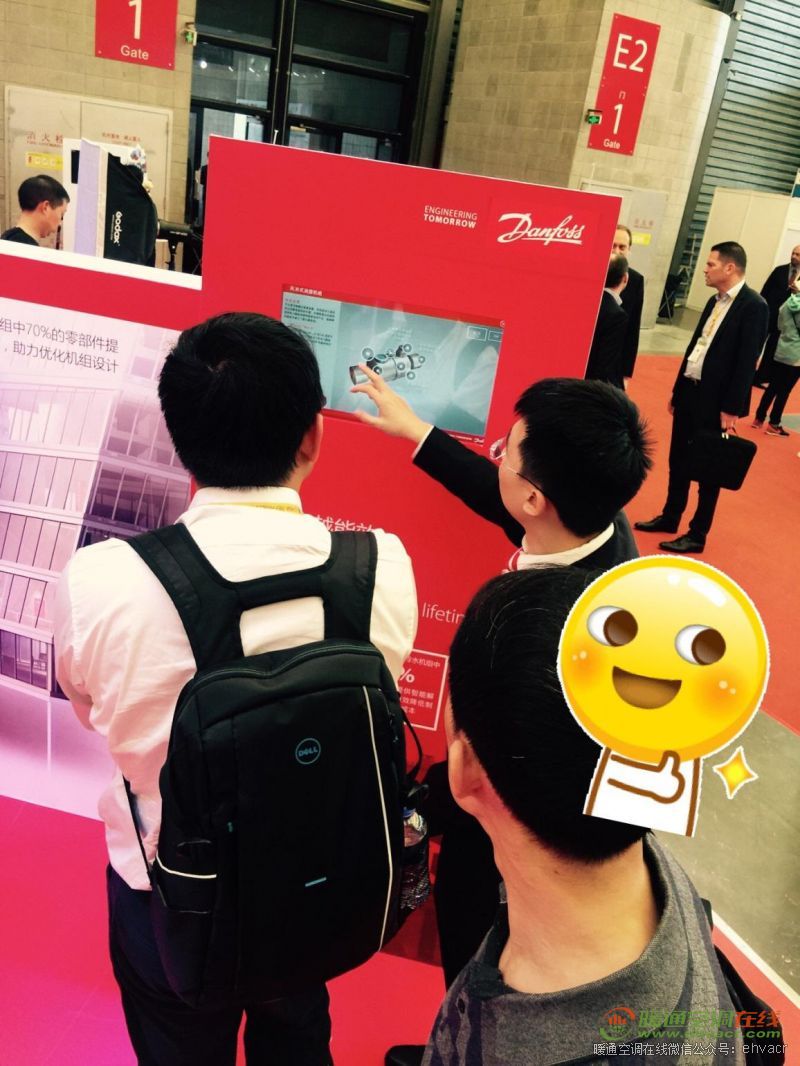 丹佛斯技术专家现场示意全新电子膨胀阀及换热器配套解决方案 互动屏演示了丹佛斯冷水机组解决方案及深入应用其中的丹佛斯制冷元件