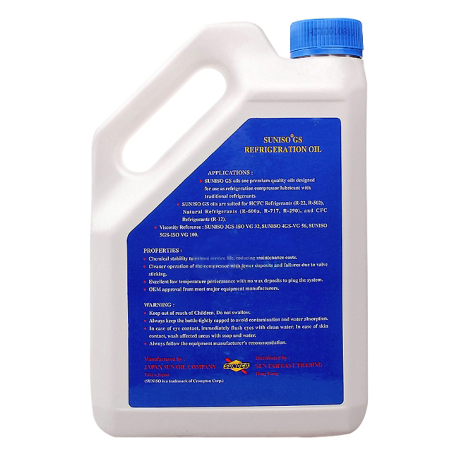 商品简介:广泛应用于空调器、电冰箱、冷柜、冷冻机等制冷系统 商品用途:可使用于往复式、旋转式、涡旋式、螺旋式和涡轮式等各种压缩机,最适合于HCFC冷媒(R-22,R-502)、自然冷媒 (R-717,R-290)以及CFC冷媒(R-12) 商品特点: 1.化学稳定性:不会与制冷剂或其它存在于系统内的材料起化学作用 2.热稳定性:不会在如排放阀等高温部位积聚过量碳沉积物 3.低蜡含量:能防止油 / 制冷剂混合物在系统的低温部位结成絮状腊质沉淀物 4.低倾点:能防止析出油凝固在管道内 5.高介质强度:确保良好的绝缘性能。在密封型机组中,油 / 制冷剂混合物是作用于马达及压缩器之间的绝缘体 6.粘度适中:虽被制冷剂稀释,仍能在极高温运行条件下有高强度的油膜。同时,在极低温条件下,仍可保持良好的流动性 7.无污染:防止擦损轴承表面,阻塞管道及过早老化